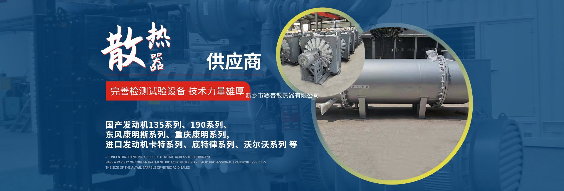 • 本公司主要產(chǎn)品有國產(chǎn)發(fā)動機(jī)系列、消防水泵專用散熱器,進(jìn)口發(fā)動機(jī)卡特系列及各大工程機(jī)械有限公司配套散熱器。